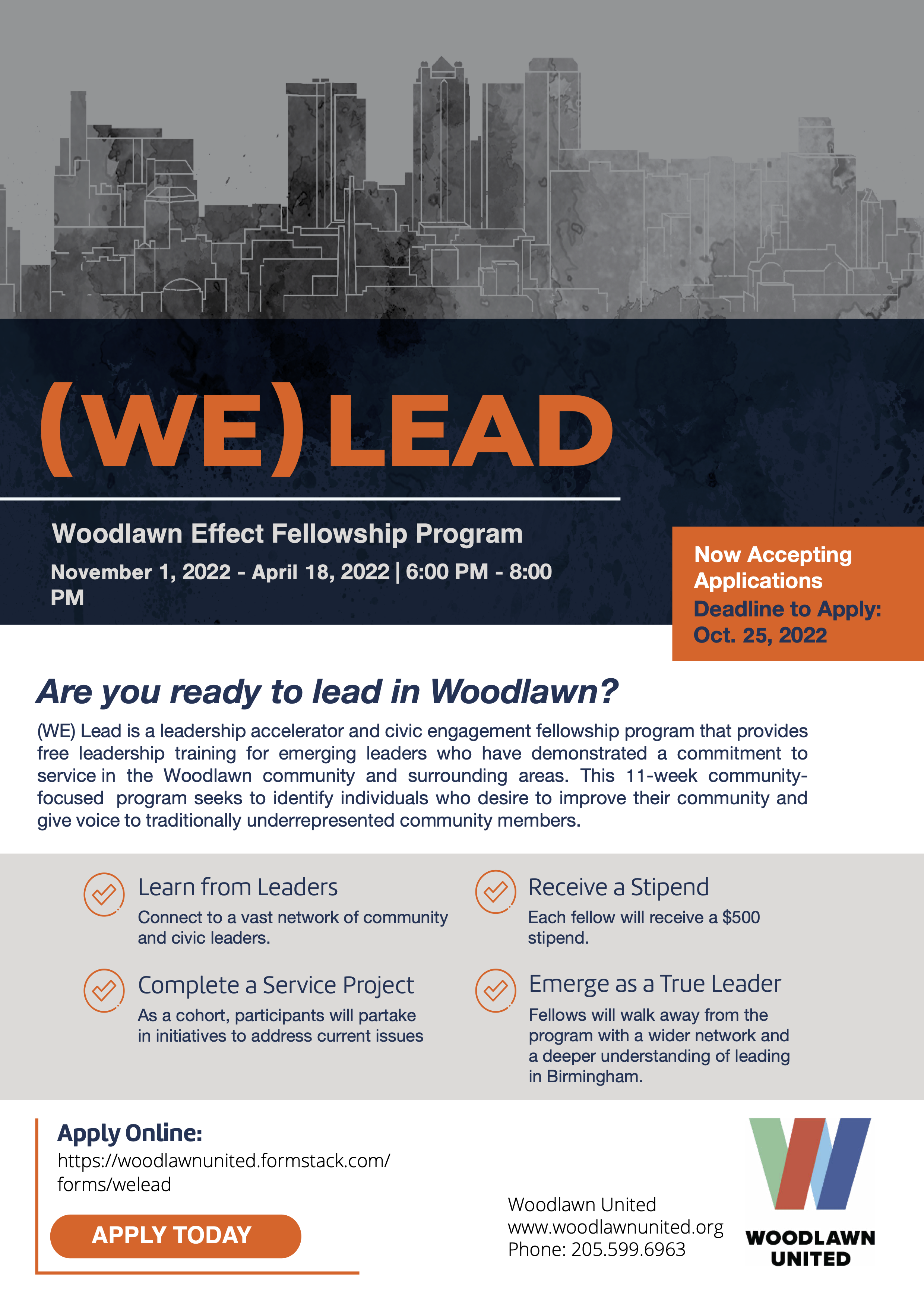 Since Woodlawn United's founding in 2010, its mission has been to serve as a catalyst and facilitator for the transformation and revitalization of the Woodlawn community in Birmingham into a vibrant and sustainable community in which its residents have an opportunity to thrive. The WE Lead was developed to address the Woodlawn Community's gap in access to leadership development opportunities. This 14-week community-focused program seeks to identify individuals who desire to improve their community and give voice to traditionally underrepresented community members. WE Lead fellows will engage in weekly training to learn from political, business, and community leaders. As a cohort, participants will partake in initiatives to address current issues impacting Woodlawn. The program goals for WE Lead Fellows are:
